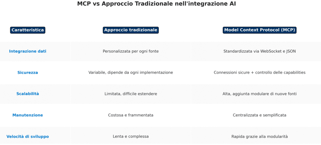 MCP nasce esattamente per superare questa frammentazione: offrendo un protocollo unico, basato su WebSocket sicuri e scambio di messaggi JSON, per permettere a un modello AI di interrogare, aggiornare o ricevere dati da fonti esterne senza dover essere “personalizzato” ogni volta.